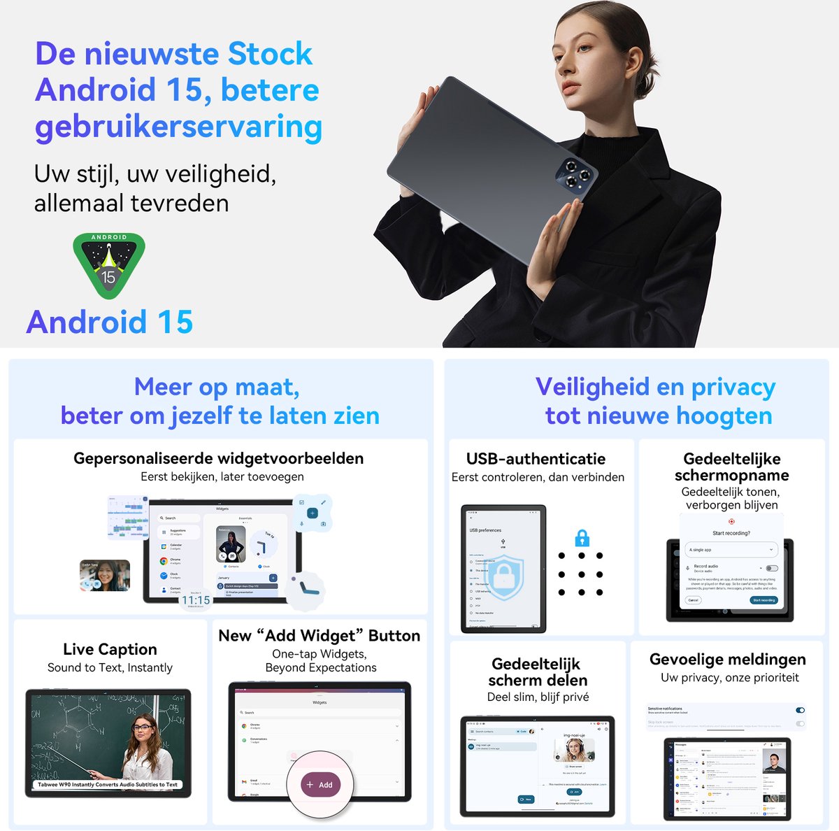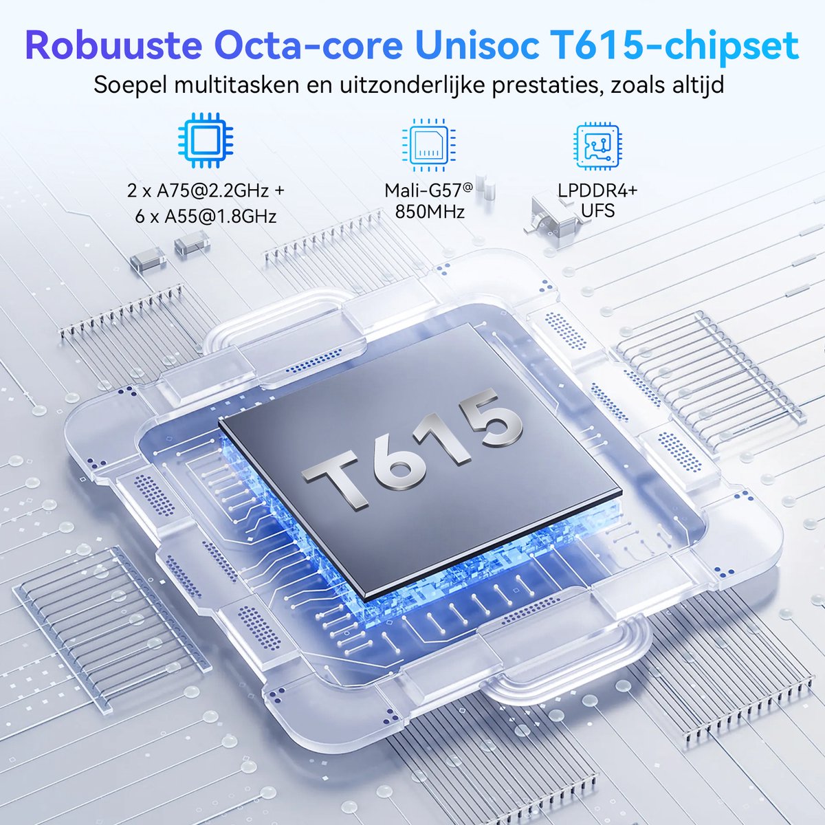 De krachtige 8000 mAh batterij biedt tot wel 15 uur onafgebroken gebruik, perfect voor lange werkdagen, studietijd of ontspanning. Met een 18 W snellader wordt opladen snel en eenvoudig. Maak heldere, gedetailleerde foto's met de dubbele AI-gestuurde camera’s: een achterzijde van 16 MP en een frontcamera van 8 MP. Dankzij gezichtsherkenning en FaceID-vergrendeling weet je dat je gegevens veilig zijn. Kortom, een tablet die ideaal is voor studie, werk en entertainment.